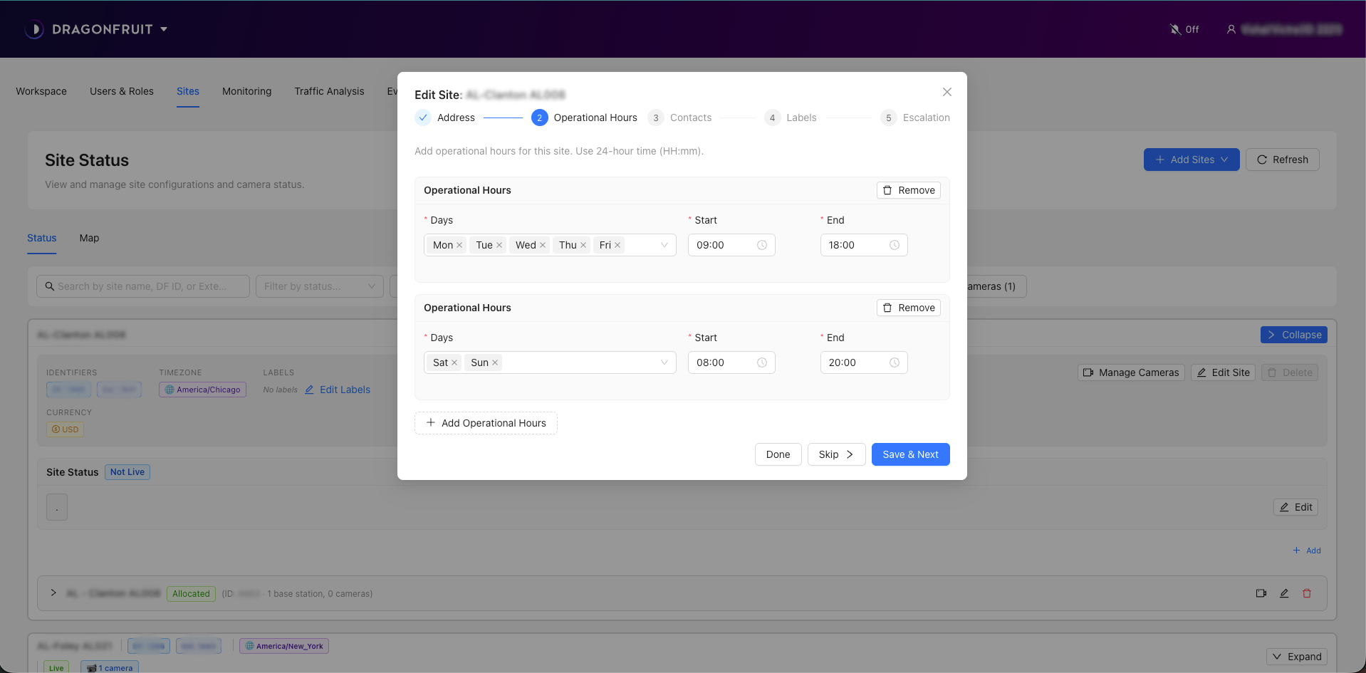 We have added an “Operational Hours” field to the Sites. The users can now configure this per site and it will be available for other apps like Traffic Analysis and Alarms to use wherever Operational Hours are required. Site import CSV also supports this field now.