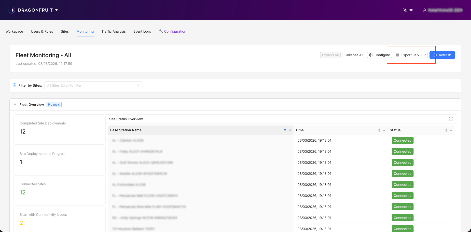 We have released a new feature to export the data of the Monitoring Dashboard as CSV. The export bundle consists of individual files for each panel in the dashboard. The export works for the expanded panels with filtered sites.